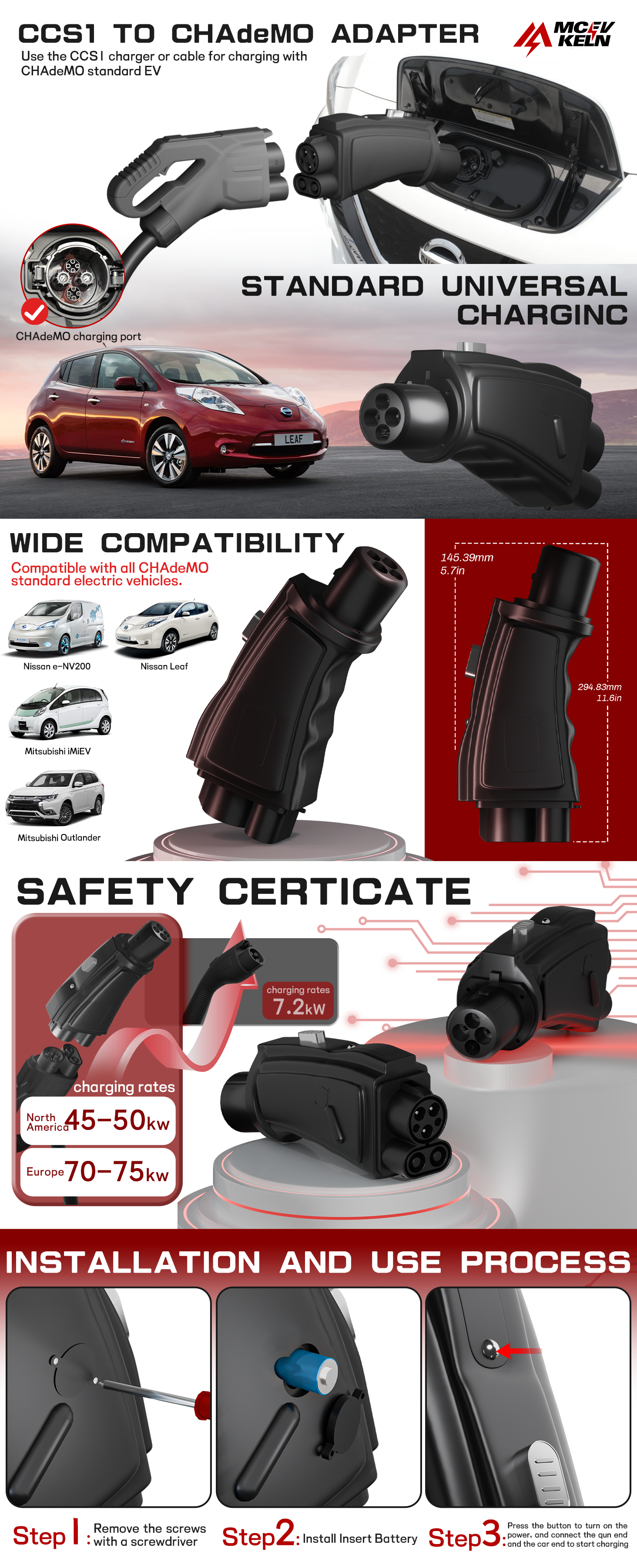 CHAdeMO standard cars to charge using CCS1 standard superchargers, Such as Nissan Leaf, Nissan e-NV200, Mitsubishi iMiEV, Mitsubishi Outlander etc.