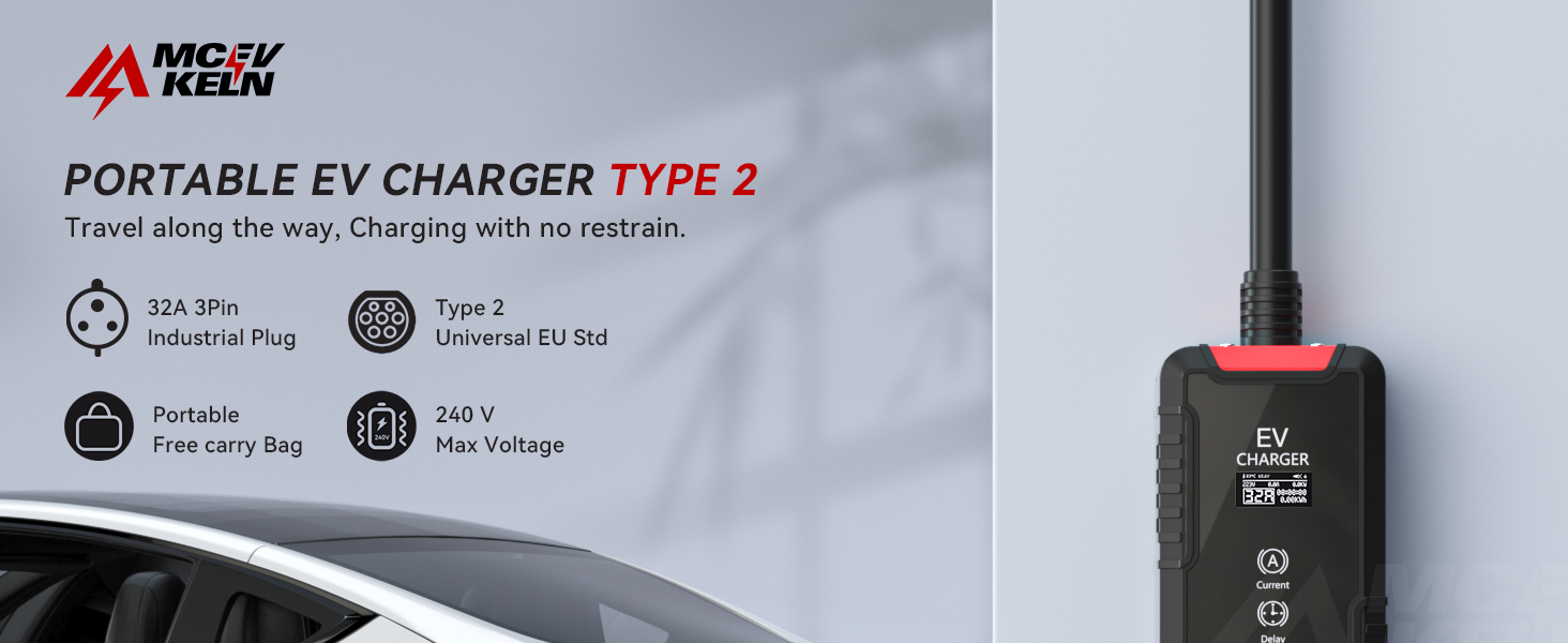 Portable Type 2 EV Charger 6A-32A With CEE Plug, IP65 Rated, 7M/10M Cable Optional With Carry Bag